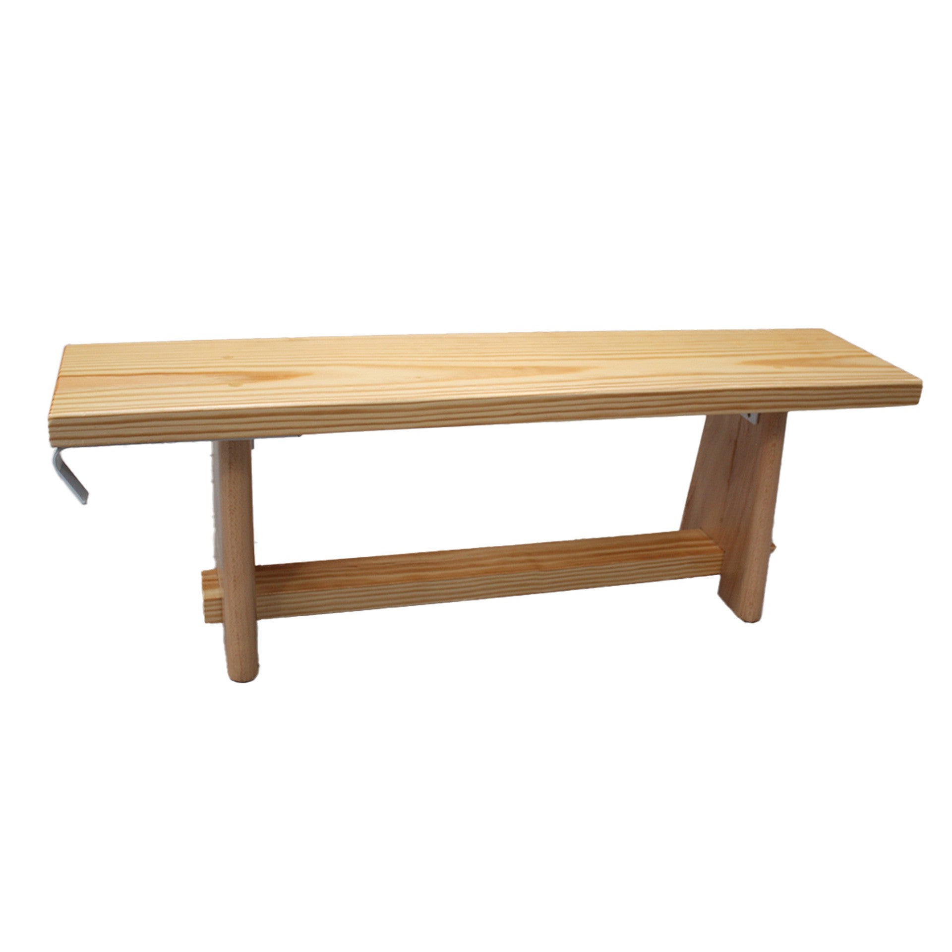 Banco sueco fabricado en madera de pino melis (tabla superior) y madera de haya (patas). Está provisto de refuerzos metálicos entre patas, de gancho metálico para sujeción a espaldera y de tacos de goma antideslizante en cada una de las patas. Tapa y patas de grosor 3,5cm. Provisto de dos patas los de 1mts, de tres los de 2mts y de cuatro patas los de 3mts. Todos los modelos son de 22cm de ancho y 34cm de alto.