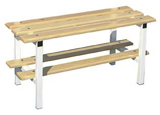 Banco formado por estructura metálica (patas) de sección de tubo 35x35mm, lacadas en blanco con pintura poliéster y listones de madera de pino melis de sección 90x20mm, barnizados y pulidos a una cara y por los cantos. Incluye también tapas de PVC para el tubo de las estructuras metálicas. Se sirve desmontado con la tornillería necesaria para su montaje. Medidas una vez montado: 38x49cm (ancho por alto). Diferentes largos del banco en función de las necesidades: 1m, 1,5m, 2m, 2,5m o 3m. Este producto es de fabricación nacional.