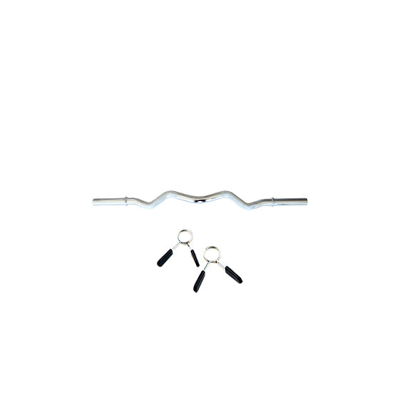 Barra de dominadas cromada en forma de Z que coloca las muñecas en una posición más natural al entrenar bíceps o tríceps. Se suministra con un kit de bloqueo de muelle. Peso: 7 kg. Longitud: 120 cm. Diámetro: 30 mm