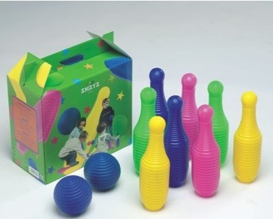 Juego de bolos de plástico en polietileno. Compuesto por 8 bolos y 2 bolas.