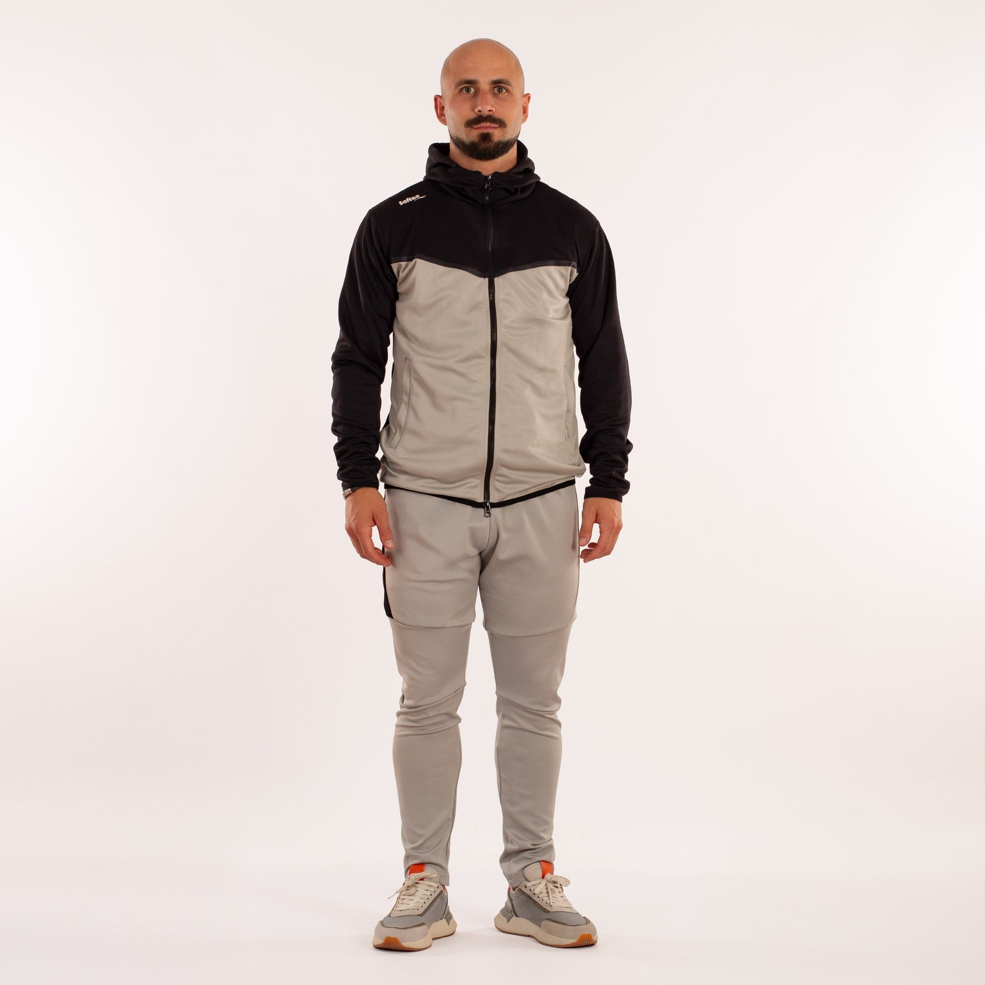 Chándal bicolor de estilo deportivo moderno compuesto por chaqueta y pantalón. La chaqueta de manga larga, Cremallera completa en el frente y capucha. Principalmente predomina el color gris y mantiene el negro en el cuello, capucha y mangas. La chaqueta cuenta con dos bolsillos con cremallera y el pantalón dos sin cremallera y otros dos en los laterales con cremallera. Además este cuenta con cintura elástica con cordón para un perfecto ajuste. Corte recto, sin puño. Chaqueta en 100% poliéster y el pantalón en 90% poliéster y 10% elastano.