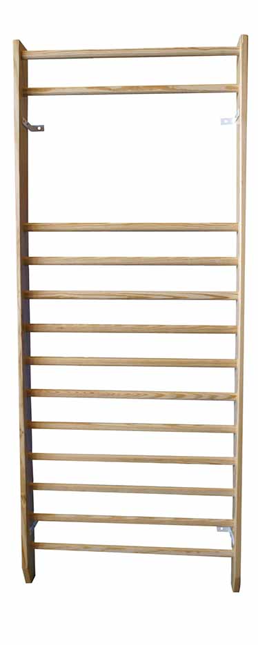 Espaldera fabricada íntegramente en madera de pino melis con listones horizontales ovalados de sección 39x27mm. Incluye 13 listones a una distancia equidistante de 11cm, excepto el hueco superior del segundo y tercer listón que es de 55cm.Todos ellos engarzados a travesaños verticales de sección 13x3,5cm. Provista de tornillería y cola para amarrar los listones a los travesaños. Además lleva 4 escuadras metálicas y tornillería para su sujeción a la pared. Se sirve desmontada. Medida: 250x100cm.