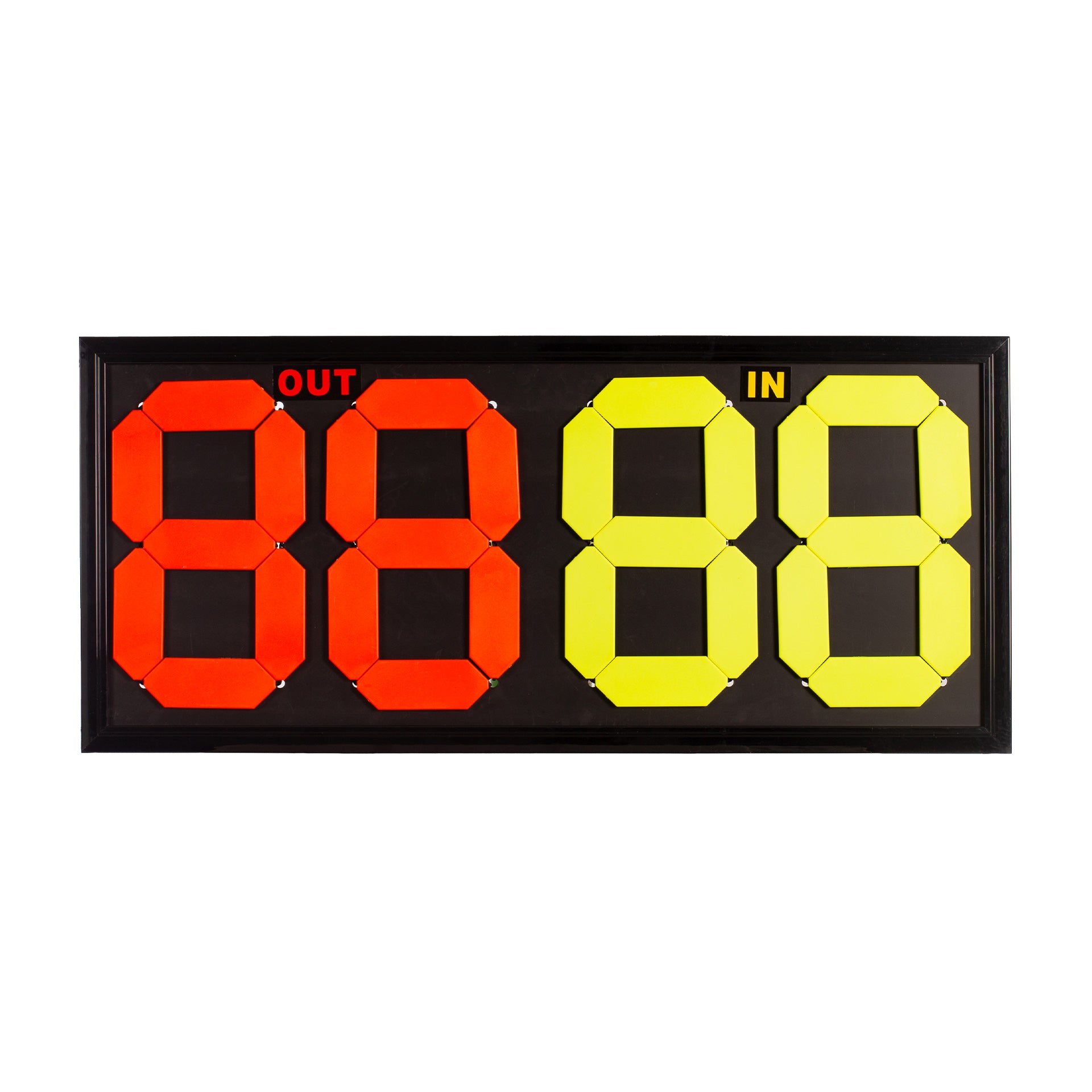 Marcador de cambios (entrada y salida) doble cara. Cuenta con 4 dígitos que se forman con placas reversibles. Numeración del 0 al 99. Medidas: 84x38,5x2cm.