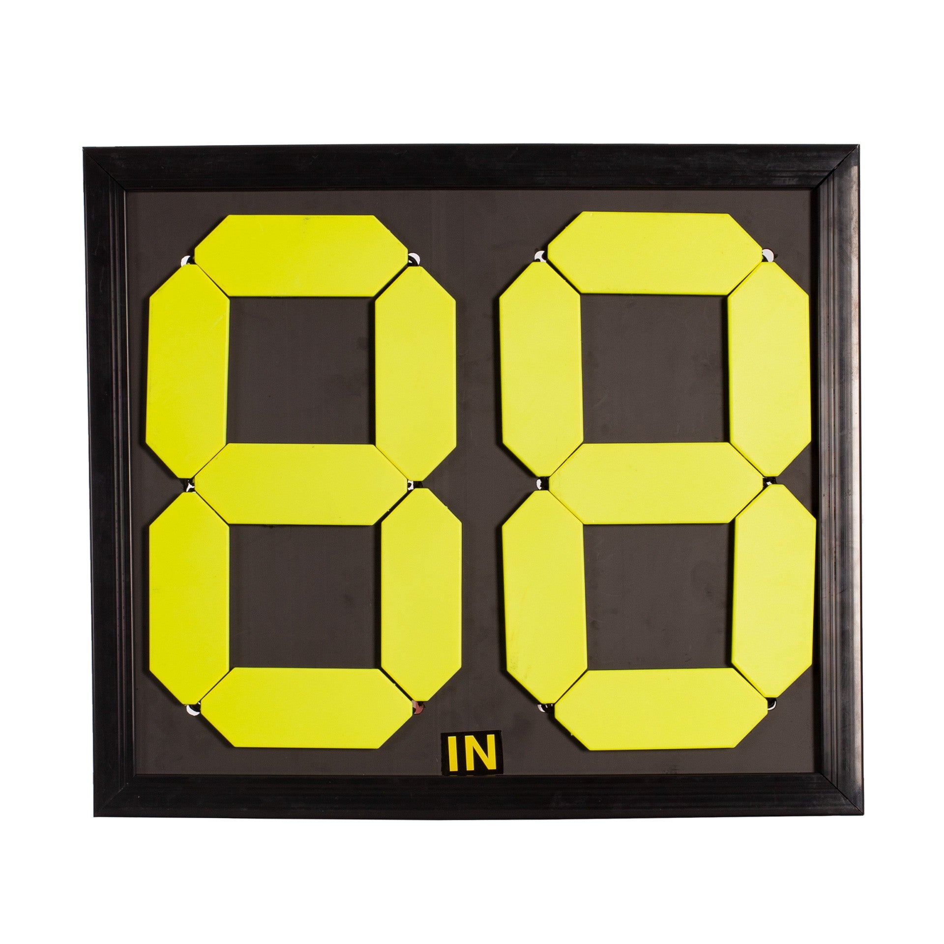 Marcador de cambios doble cara (una cara con la entrada y otra con la salida). Cuenta con 2 dígitos que se forman con placas reversibles. Numeración del 0 al 99. Medidas: 43,5x38x2cm.
