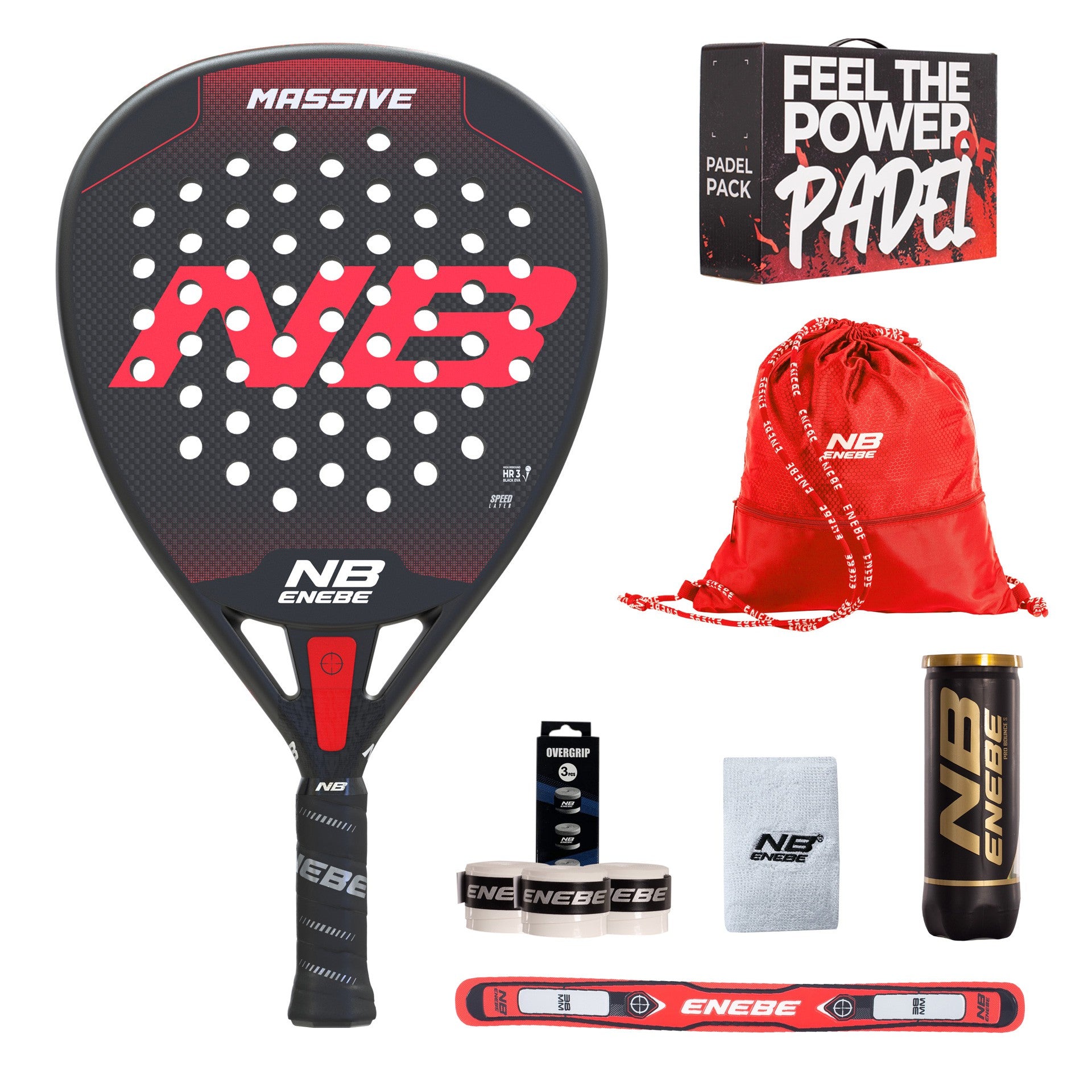 - Pala de pádel Enebe Massive roja: conserva las mismas especificaciones técnicas de las versiones anteriores con variaciones en el diseño. Este año se presenta con un nuevo color más intenso, así como con ligeros cambios estéticos.