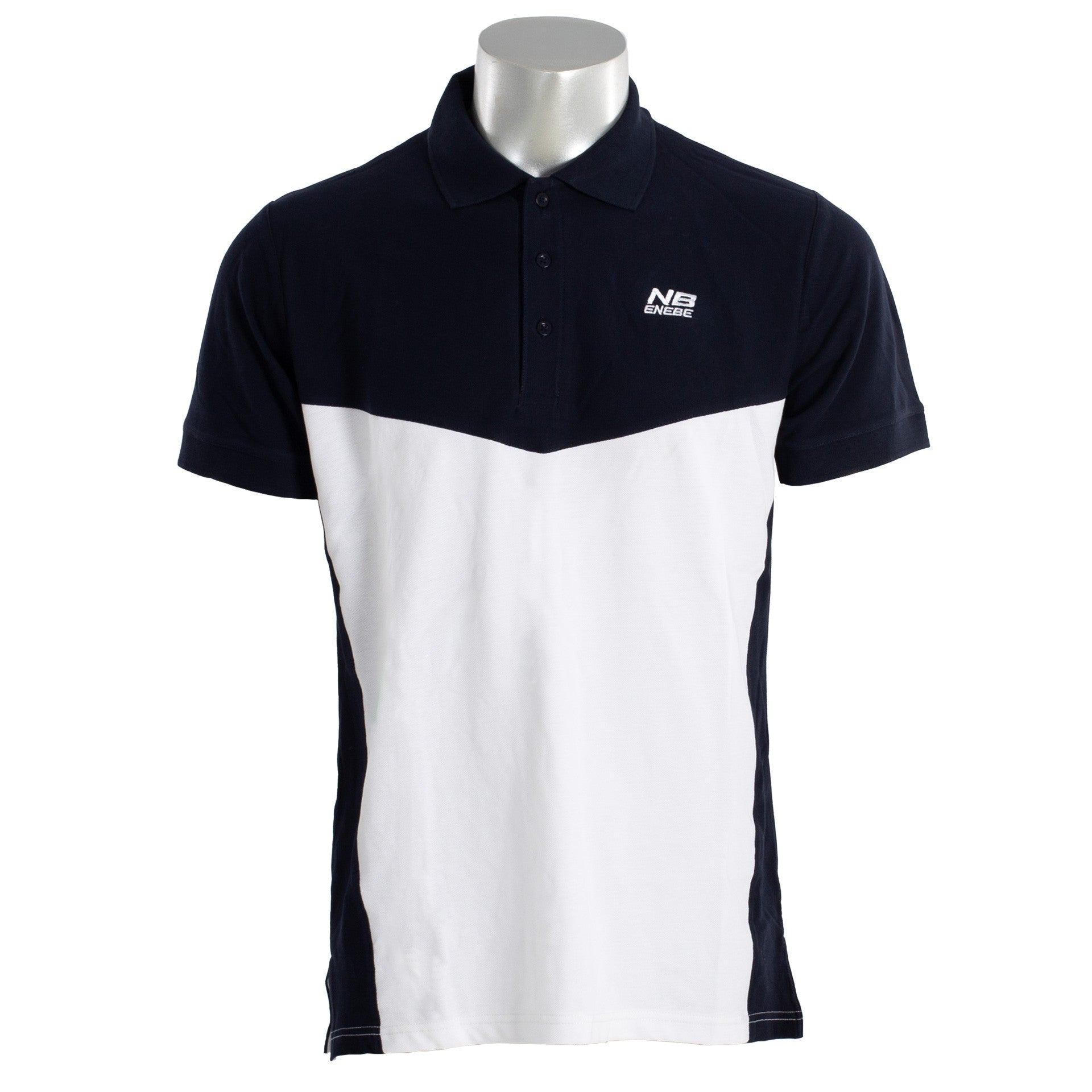 Polo bicolor de la marca Enebe fabricado en 80% algodón y 20% poliéster. Presenta un diseño moderno con parte superior en color marino y la parte frontal inferior en color blanco. Incluye logo bordado en el pecho y cuello polo con tres botones.