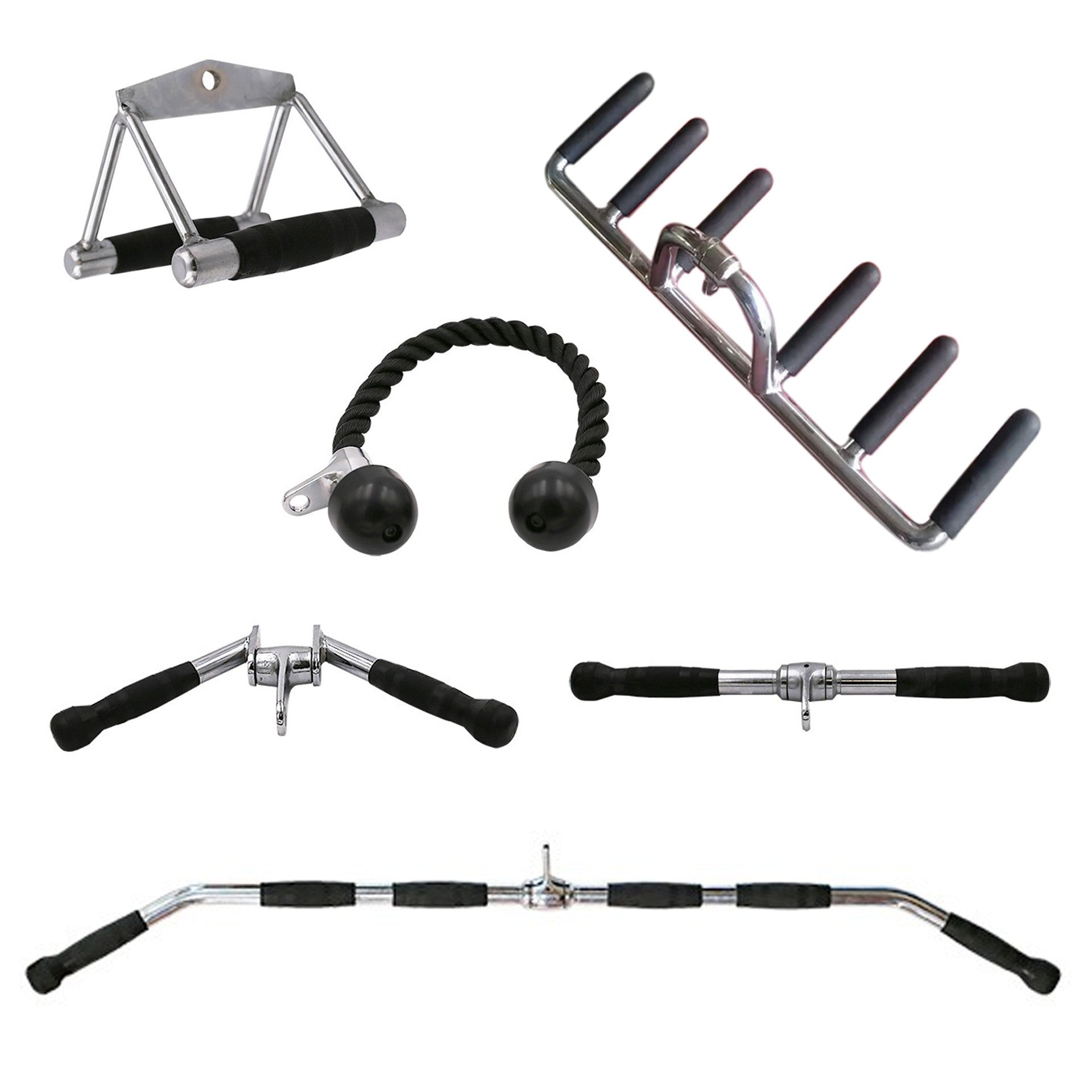 Set formado por: 1 agarre remo: Fabricado en acero cromado con agarre engomado para evitar que resbalen las manos. 1 agarre de cuerda tríceps: Cuerda para ejercicios de tríceps. 1 barra dorsal: Accesorio para máquinas fitness que ofrece diferentes opciones de agarre para trabajar varios grupos musculares. Asas en goma para un mayor confort. Medidas: 120cm. 1 agarre en V polea tríceps/bíceps: Manillar con forma curva que permite diferentes tipos de agarre para realizar ejercicios de tríceps. Fabricado en acero cromado y agarres engomados. 1 agarre de bíceps: Manilla rotativo con agarres engomados para evitar que se resbalen las manos. 1 agarre tres posiciones dorsal: Barra concebida para musculación. Permite que los entrenamientos sean más variados y versátiles dadas sus tres posiciones. Se puede enganchar a cualquier máquina. Cuenta con agarres ergonómicos para un mayor confort. Medida: 40x16cm.