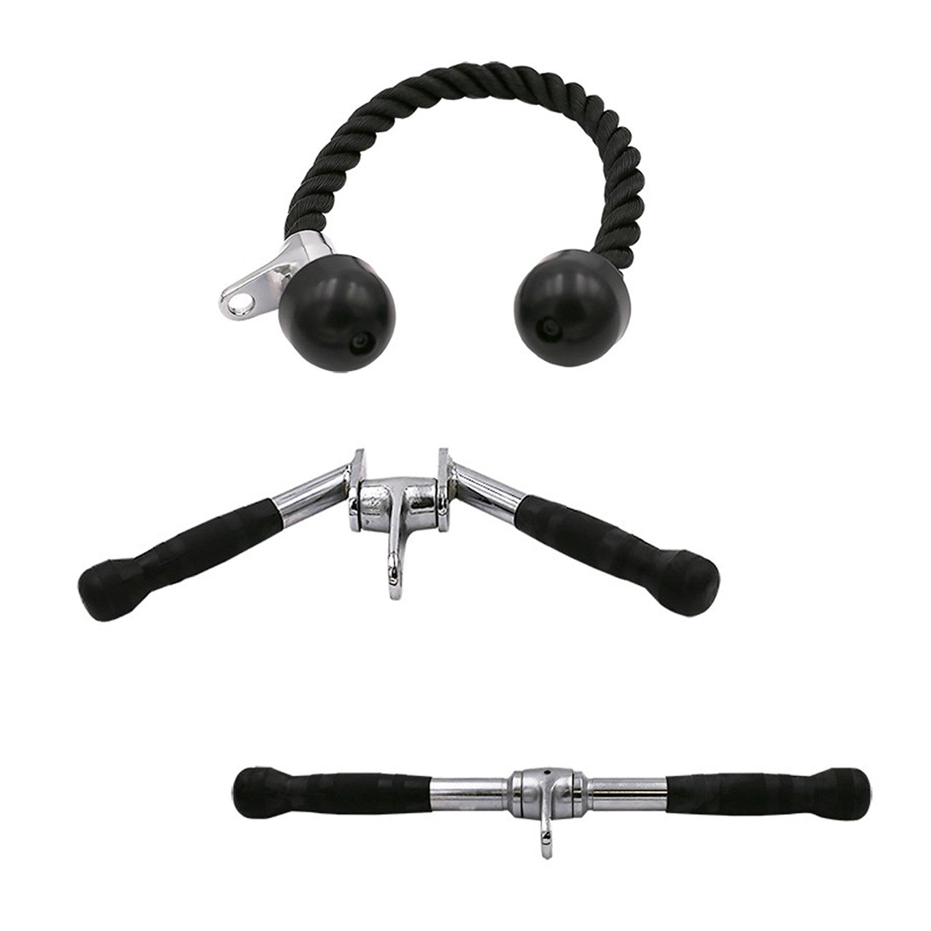 Set formado por: 1 agarre de cuerda tríceps: Cuerda para ejercicios de triceps. 1 agarre en V polea tríceps/bíceps: Manillar con forma curva que permite diferentes tipos de agarre para realizar ejercicios de tríceps. Fabricado en acero cromado y agarres engomados. 1 agarre de bíceps: Manilla rotativo con agarres engomados para evitar que se resbalen las manos.