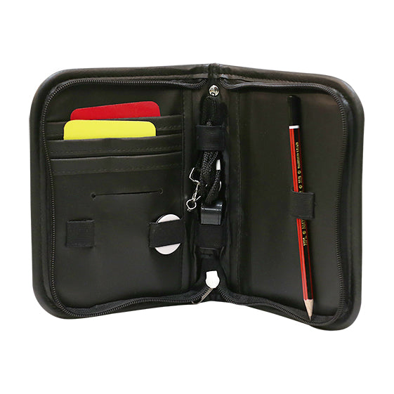 Set completo de imprescindibles de árbitro en una cartera con cierre de cremallera. Idónea para llevar todo y no perder nada. Incluye tarjetas roja y amarilla con cantos redondeados, silbato de plástico con correa, lápiz, cartera con varios compartimentos y una moneda sorteo (B/N). 20x16x3cm.